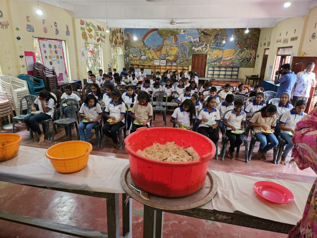 Immer Samstags findet Zusatzunterricht für unsere Patenkinder der Klassenstufen 6 – 10 in unserer Privatschule als Ergänzung zur staatlichen Schule in Englisch, Mathematik und EDV statt. Da der Armut wegen viele unserer Patenkinder zu dünn und zu klein sind, gibt es zusätzlich zur Bildung ein reichhaltiges Mittagessen, das von Müttern der Patenkinder im Tempelbereich ehrenamtlich zubereitet und ausgegeben wird. Die hierfür notwendigen Lebensmittel können dank Ihrer Spenden an unsere Hilfsorganisation vom Karlsruher Children Center gekauft und bezahlt werden.
