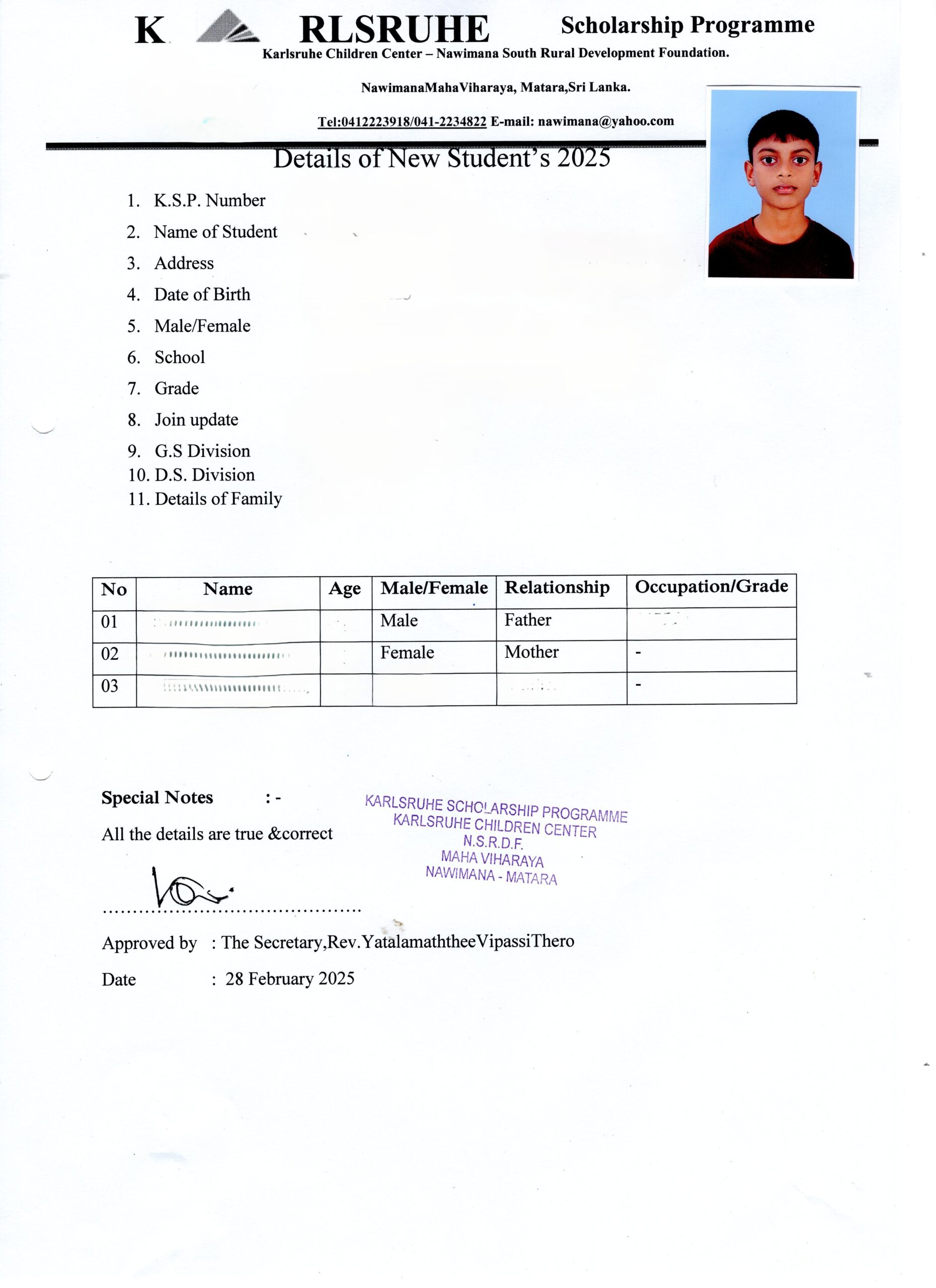 Alle Kinder werden nach einem intensiven Auswahlprozess als Schülerinnen und Schüler im Karlsruher Children Center in Matara in das „Karlsruhe Scholarship Programm“ aufgenommen. Zu jedem Kind erhalten wir über unseren örtlichen Projektleiter, Reverend Yatalamatte Vipassi Thero, einen „Steckbrief“ mit Foto, Namen und Alter des Kindes und einigen Informationen über die Familie und den Namen der staatlichen Schule in die es geht. Bei Übernahme einer Patenschaft geben wir diesen „Steckbrief“ an Sie weiter. Lesen Sie im Bericht aus Matara mehr zum Auswahlprozess.